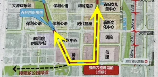 从栏杆堰绿道往南,天府二街、三街和四街为地面段部分。三条街均会通过修建跨街高架与铁像文旅环前后段连通,目前,三个高架均在打围修建。