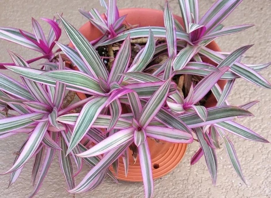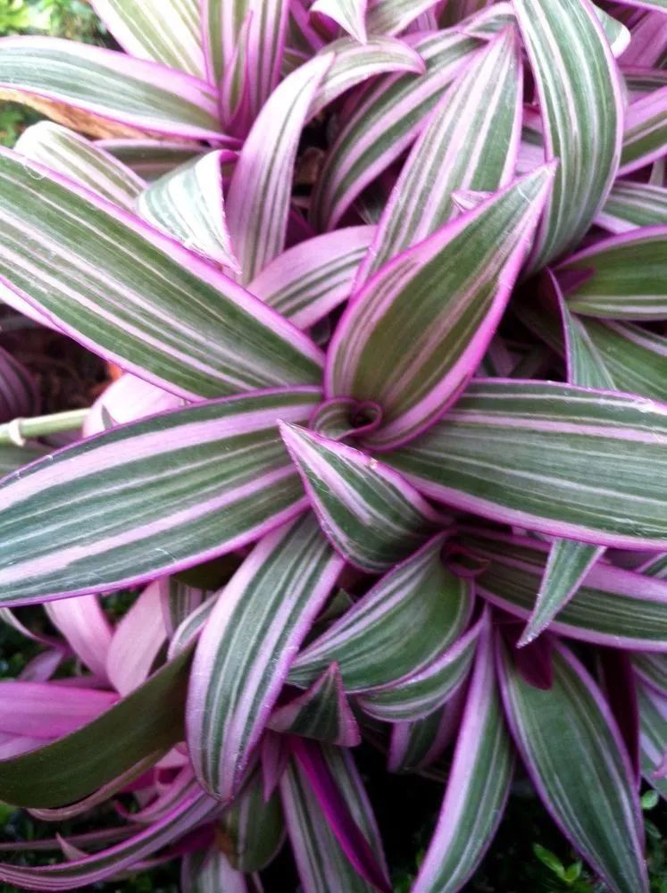 现在最受欢迎的就是叶子上混杂着三种颜色的蚌兰,叶面上就有绿色、粉色和白色的条纹,而叶背则是紫色的。这种就是三色蚌兰是属于鸭跖草属的一种植物,就和我们生活中常见的吊竹梅、紫竹梅和紫露草有较强的亲属关系。