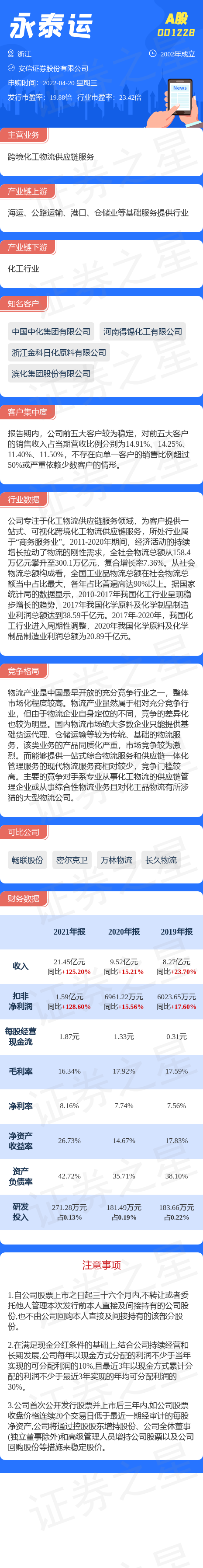 永泰运4月20日网上申购,申购代码为001228,中签号公布日期为4月22日。该股概况请见下图:
