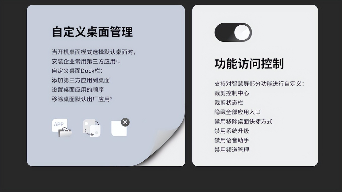 以上这些,都是相较于传统商业屏表面的显示功能而言,商用智慧屏毫无疑问要比“表面的功能”更复杂些,主要区别于一般显示场景、重视定制化、交互性、功能的稳定性等等。这次重点谈谈华为智慧屏 B3 系列的这些功能。