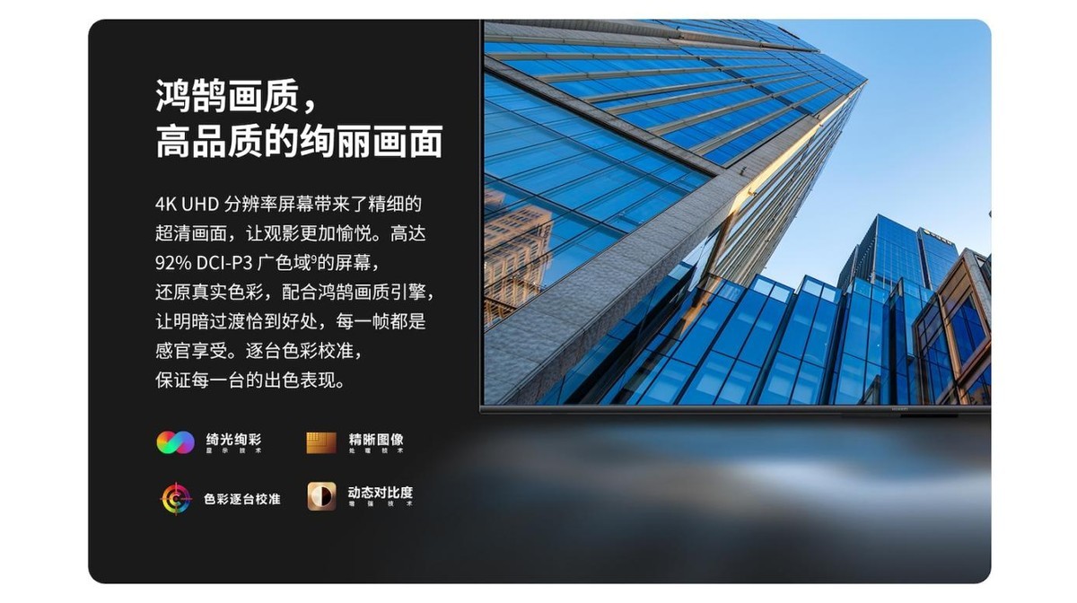 既然是智慧屏,必然与传统屏幕有不一样的区别。首先看看该系列的外观设计,采用超窄边框,视觉上做到了三面无边框,看着非常有沉浸感,四周采用一体成型的工艺,十分精致;4K屏幕,97%屏占比,色域覆盖率 92% DCI-P3,178°可视角,这些近乎完美的配置,加上鸿鹄智慧芯片独特的色彩校准,直接把观看体验拉满,我想这在同价位段上应该找不出比这更出色的显示屏幕了。