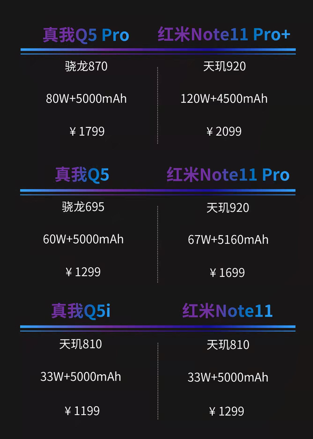 从这份配置对比图中我们也能直观的感受到真我Q5系列和红米Note 11系列详细的硬件、续航以及售价规格。而对于备受大家关注的真我Q5 Pro和红米Note 11 Pro+这两款产品来讲,它们主要的区别还是存在于续航组合与价格这两个点上。要知道真我Q5 Pro是目前市面上首款将百瓦以下最强快充技术应用到千元机价位上的产品,同时结合各项配置我们也能明显看出真我Q5 Pro要比红米Note 11 Pro+更具优势。