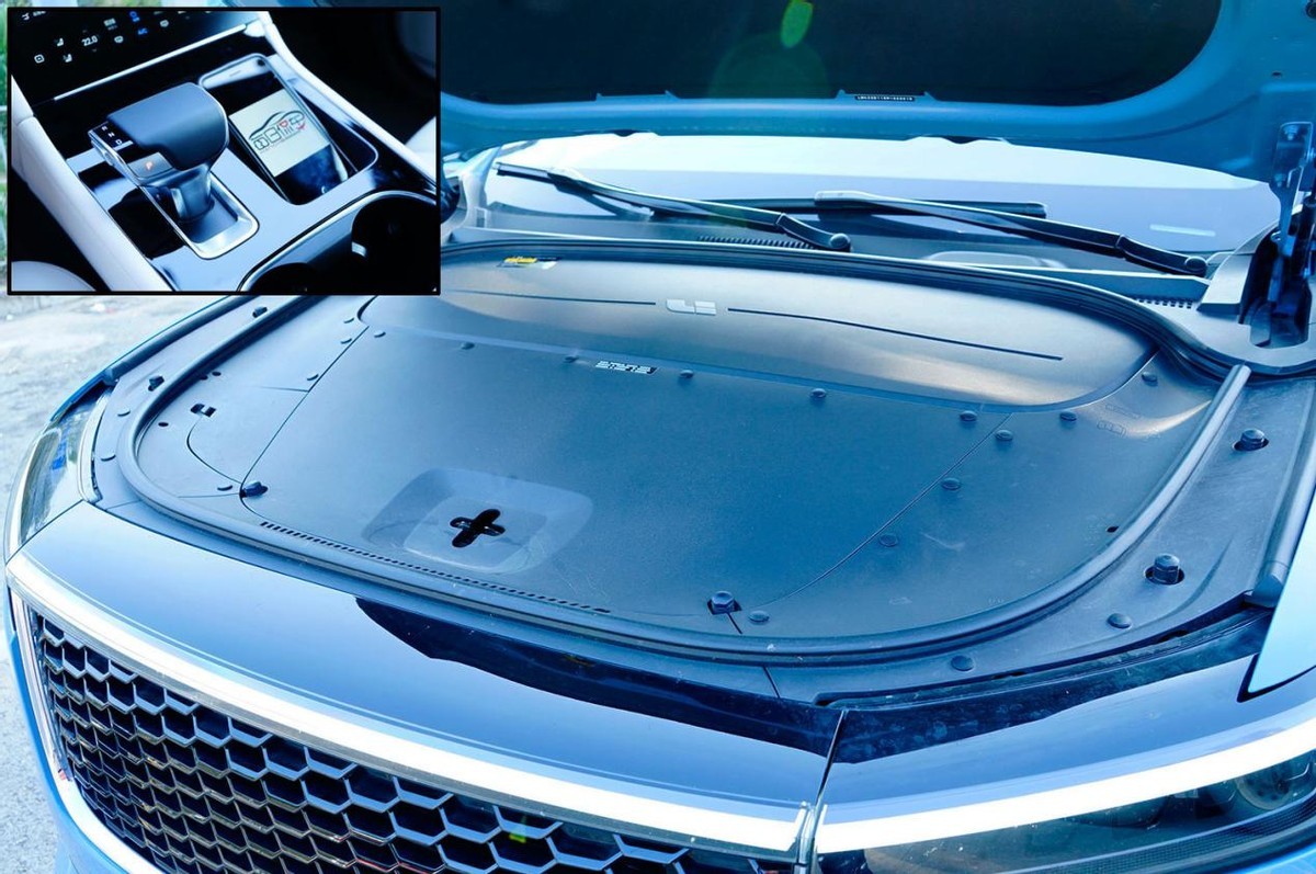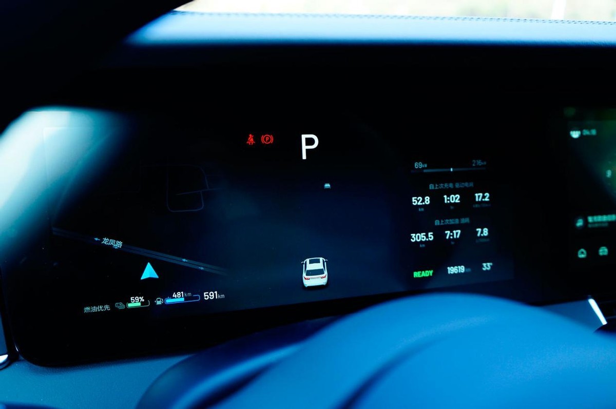 在电能管理上,有纯电优先、燃油优先、油电混合和弹射起步四种模式可选。弹射起步时增程器会强制启动增加电能,同时电池也会大功率放电,前后双电机都会处于高功率输出状态,零百加速6.5秒就是此模式下完成的。实际感受,动力输出确实很快,但不会有强烈的推背感,毕竟整备质量2.3吨的车身比较沉,加速感觉是又快又稳。不过,弹射起步模式在电池电量低于60%之后就不能启用了。纯电优先模则非常适合于市区通勤,它会优先使用电池里的电量驱动,在电池电量低于20%时才会强制启动增程器补电,这个逻辑还是比较合理,毕竟电池电量不宜时常放空。燃油优先模式和油电混合模式也并非上来就用油,毕竟如果电池是100%,那么动能回收、增程器多余的电量都无处安放,浪费了实在可惜,因此这两个模式在满电状态下也会先释放电池电量驱动,但增程器的启动时机不同。燃油优化模式在电量处于70%或以下时启动,而油电混动的“启动线”是电量80%。除了启动时机不同,增程器在油电混合模式下的充电效率也会低一些,感觉发动机的震动会小一些。不过,这台发动机它只要启动,我们肯定能感觉到,加速时电机也有轻微的啸叫,能量回收时也有一种奇怪的声音,好在这些都不算明显,整体的静谧度还不错,只是高速时风噪显得比较大。高速行驶,后段的动力也不弱,深踩油门后劲比较足,我们在封闭路段最快跑到了150km/h,动力还有余量。