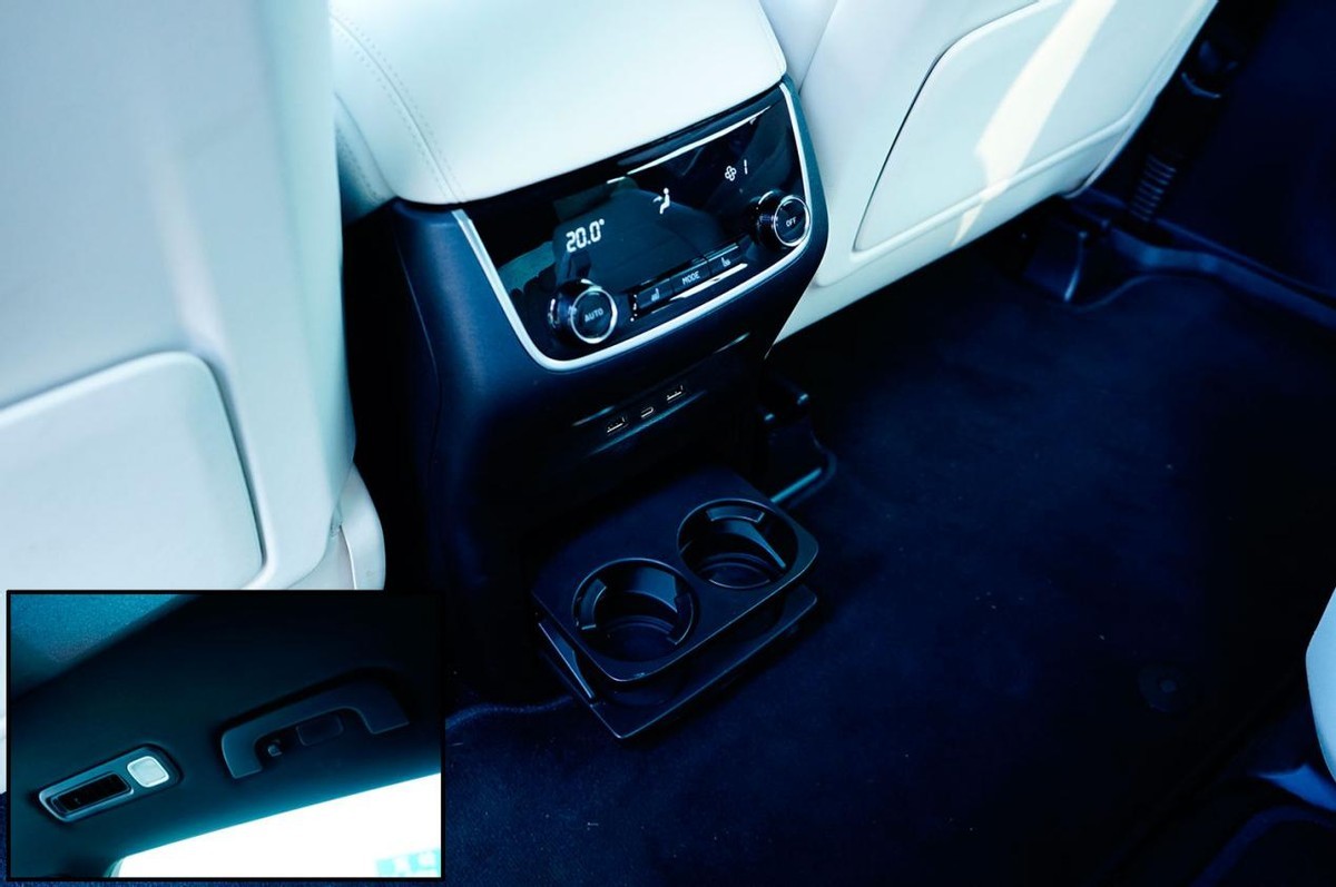 中央地板完全平整,提供地台式空调面板,出风口为顶置布局。还有两个USB和Type-C接口,提供两个弹出式水杯架,功能性上没有缺失。