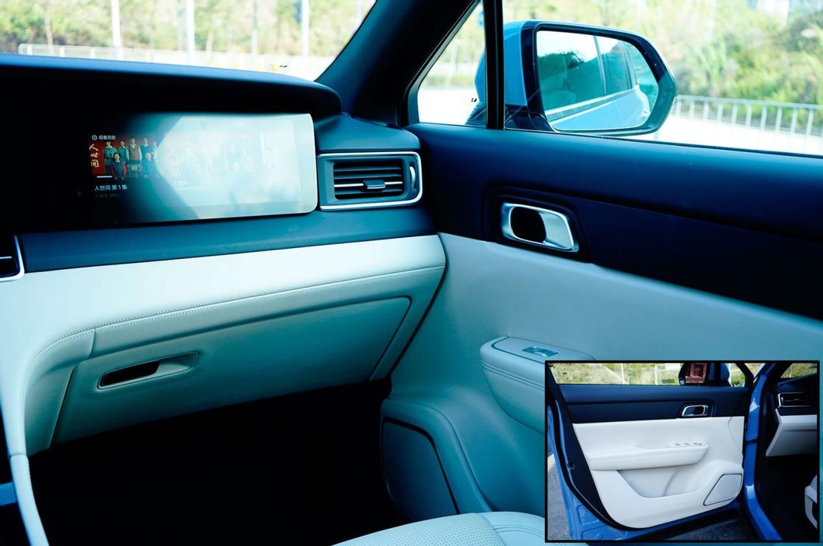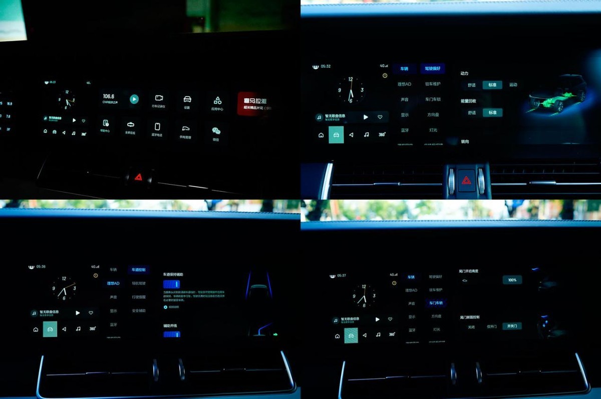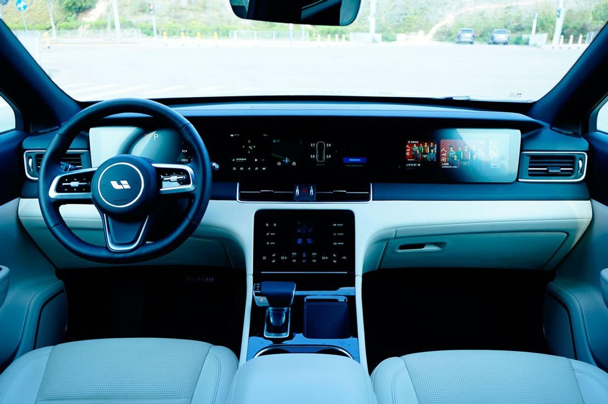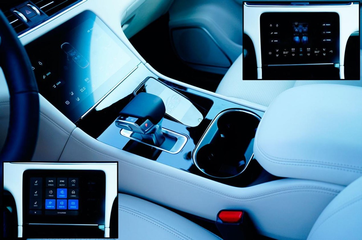 车厢内部变化不大,“T”字形中控台被四块屏幕填满了,上方的三块联屏分别是12.3英寸、16.2英寸和12.3英寸,下方单独一块屏幕是10.1英寸,每块屏幕的功能与权限都十分清晰,基本没有实体按键,平整性不错。相比之下,挡杆台就显得有些突兀了。车厢的用料也没问题,白色部分都是仿皮材质,触感舒适。