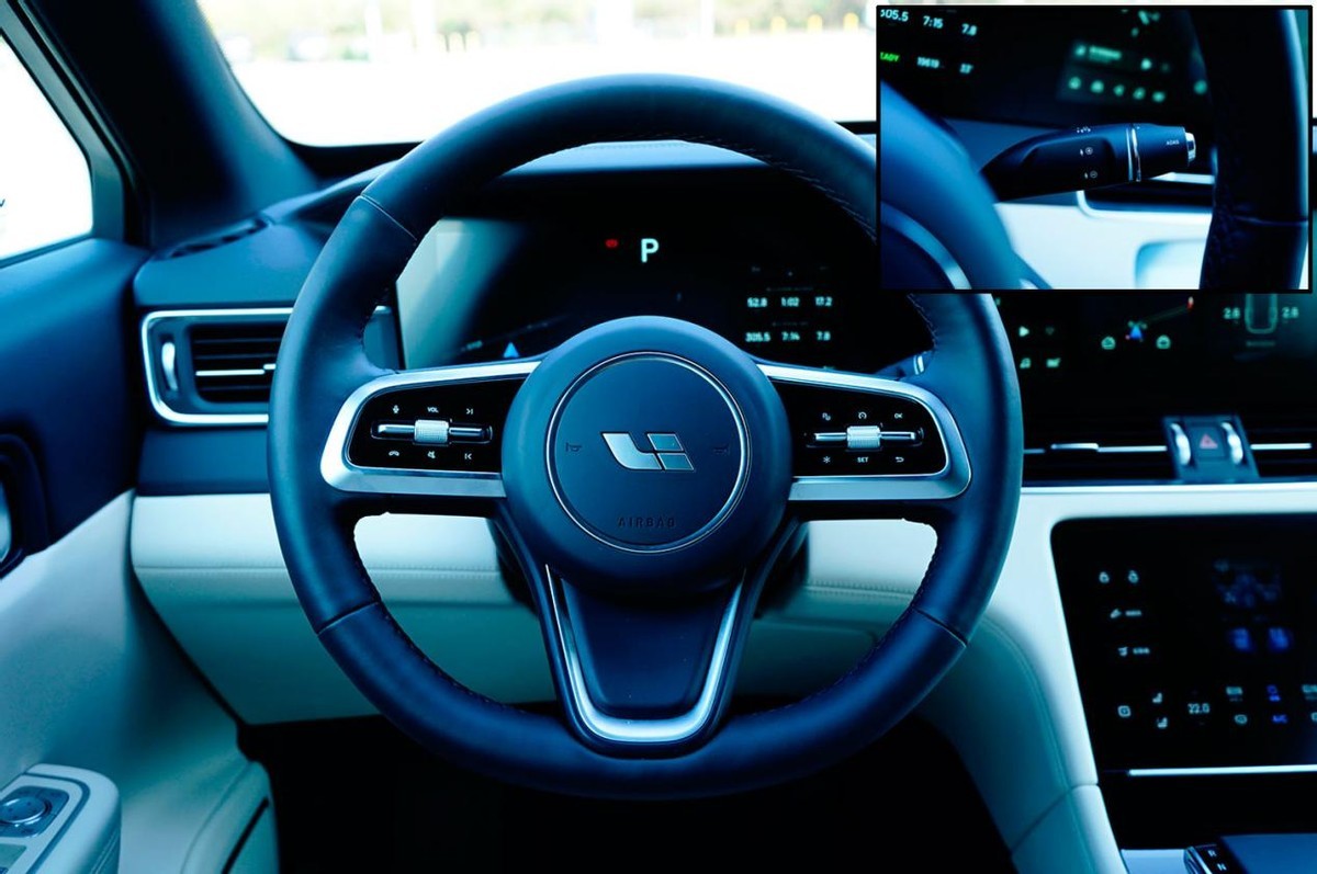 三辐式多功能方向盘采用真皮包裹,尺寸非常合适,触感也很舒适。主要变化是多功能控制改为拨杆+滚轮,与其他车的控制逻辑不同,不过稍微适应一下也没问题。驾驶辅助依然采用拨杆控制,位于右后方,与特斯拉的操作逻辑基本相同,后拉一次是纵向辅助,后拉两次增加横向辅助。新车的辅助系统升级了NOA导航辅助驾驶,具备辅助变道和自动下匝道的能力。