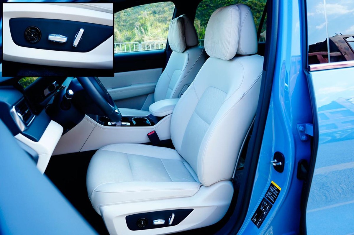 前排座椅采用真皮包裹,白色皮面看起来够高级,注意不要弄脏。内部物软硬适中,有适当的形变量带来较好的贴合性,坐垫的承托性和靠背侧向支撑都足够,增加软质头枕格外舒适。座椅功能很完善,配备了4向高低调节和4向腰撑调节,保证不同身材腰部支撑性,还增加了按摩功能,舒缓疲劳。同时还有通风、加热和记忆(驾驶位)功能。