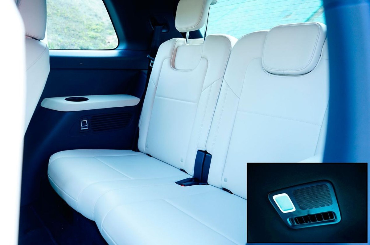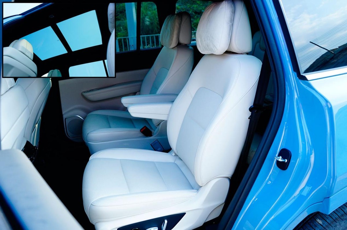 第二排两个独立座椅舒适性与前排相当,还多出了可翻折扶手,前后电动调节的幅度较大,同样提供腰撑调节、按摩和加热功能,只是少了通风功能。空间方面非常充裕,头顶有两拳多,中央还有宽阔的过道,车顶还有可开启的全景天窗。这样的乘坐品质,确实比三座布局高出了很多,而且进出第三排也便利很多。