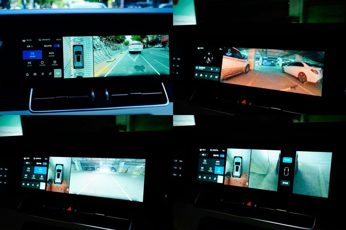 这台车尺寸很大,在狭窄路段时盲区很大。它充分利用智能装备缓解驾驶的焦虑,低速时不管哪个方向有障碍物,只要在1米内,屏幕中都能直观地标记出来,有声音提醒和具体的距离数字,还会自动打开360°全景影像,还能切换车轮视角和超广角,把盲区都覆盖到了,驾车就可以很安心了。