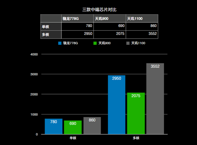 因此,高通骁龙778G这款处理器是介于天玑900系与天玑1100之间。而且通过跑分也可以证明这一点。