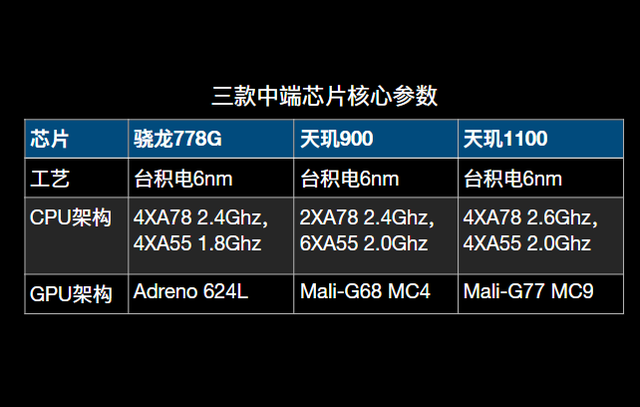 骁龙778G,天玑900,天玑1100都是采用台积电的6nm工艺制造,并且都是内置5G基带,因此,能效比会更高,加之台积电的工艺技术优势,会令芯片的能效更进一步。