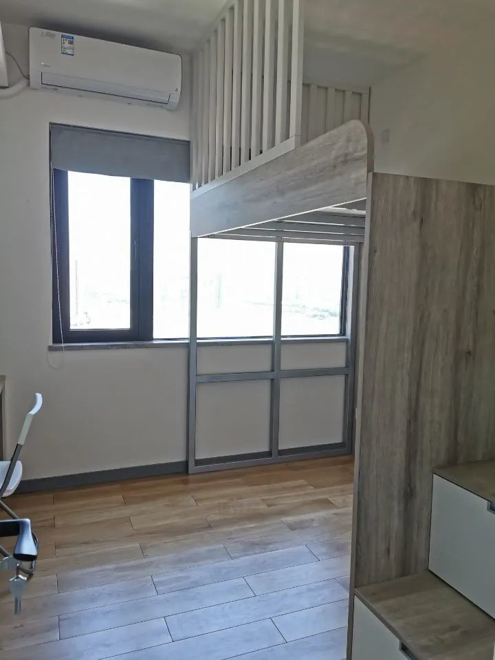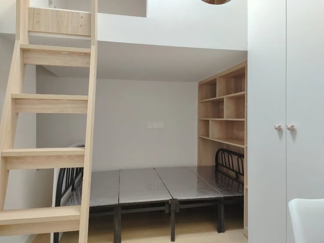定制柜子的时候,可以让做柜子的人做一个举家托起的高架床,床下空间做高一点,然后根据自己需求在床下空间再定制上书桌或衣柜,需要注意的是这样做定制高架床的时候,记得让定制商家给床架做一个加固的厚板材或钢架,毕竟这么高的床,中间脚架很长,不加固的话怕不够稳固。