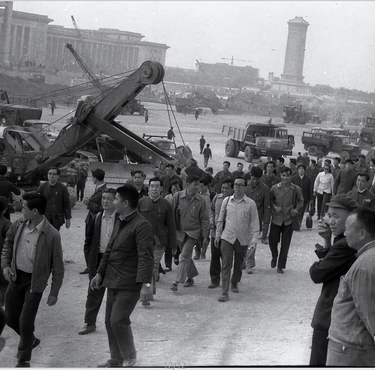 图为1977年,建设中的毛主席纪念堂。首都各界人士冒雨参加劳动。