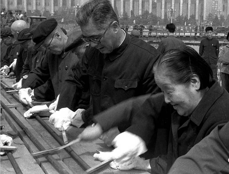 图为1977年,著名商人荣毅仁、司法部首任部长史良参加纪念堂建设义务劳动。当年,还有很多解放军的官兵也积极投身到纪念堂的建设中。