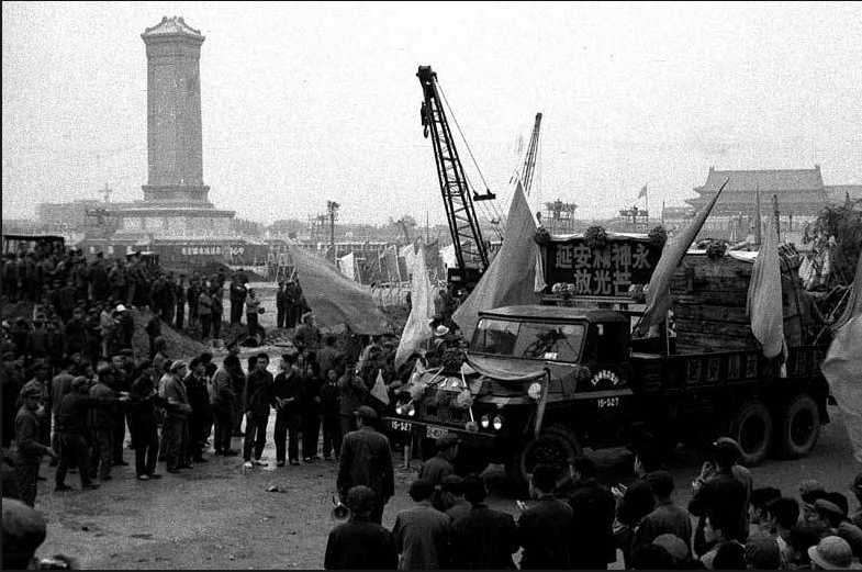 纪念堂工地施工工人们迎接延安送来的松树。当年,种在纪念堂周围的松树是不远万里专门从延安运送过来的。