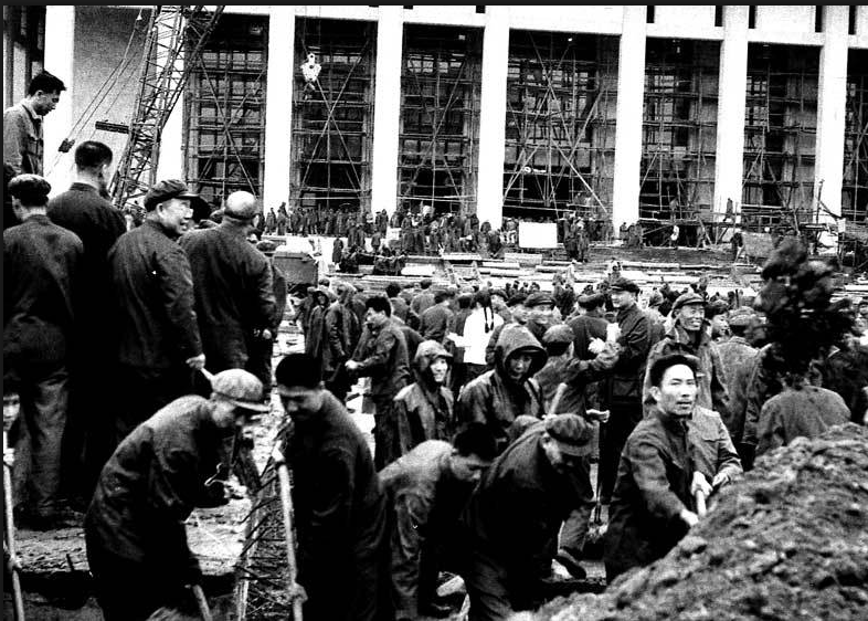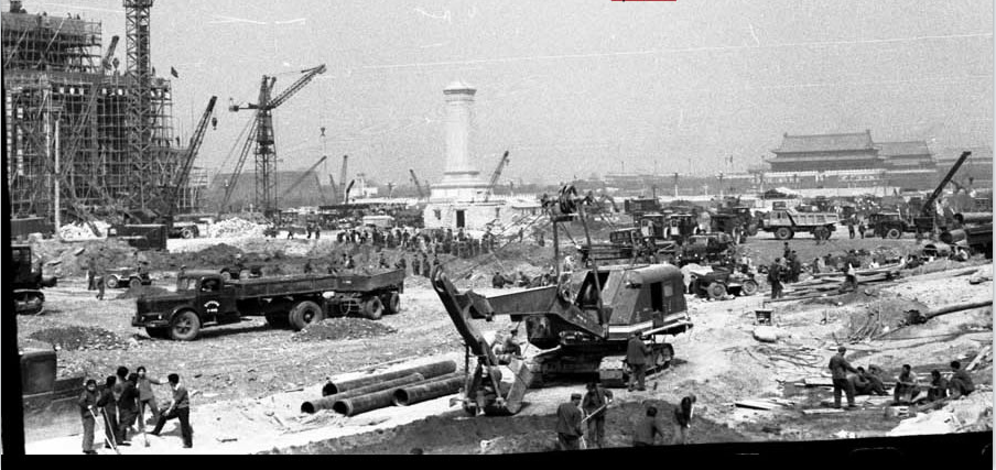 图为毛主席纪念堂施工工地。从照片上我们可以看到,施工现场非常繁忙,有机器、有工人,一派热火朝天的景象。