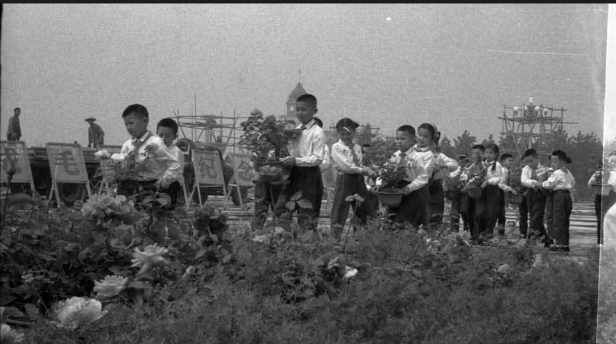 图为1977年,北京少年儿童正在摆放种好的花儿。