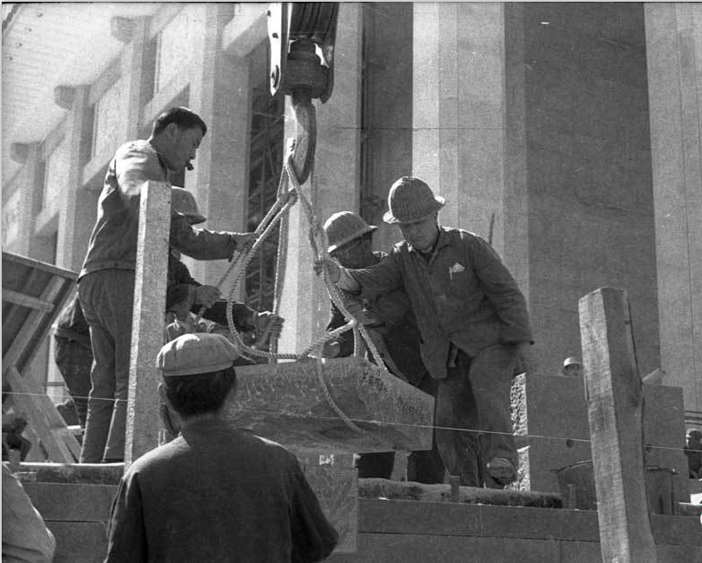 图为毛主席纪念堂施工现场,工人们正在小心翼翼地吊装一块巨大的石板。