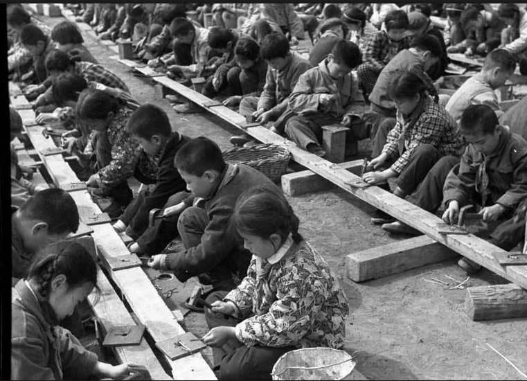 当年,除了解放军官兵、各地干部之外,还有不少青少年儿童也自愿参与到纪念堂的建设之中。图为1977年,首都少年儿童在纪念堂施工工地劳动,他们正在用锤子把用过的旧钉子给掰直了。