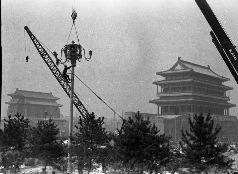 图为毛主席纪念堂施工现场,工人正在小心翼翼地安装华灯。当时,限于技术比较落后,整个纪念堂的施工难度还是比较大的。