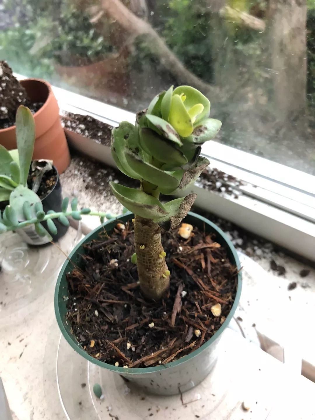 有一点特别关键,平常浇水的时候不到不要浇到叶子的顶部,叶片顶部不要老是有积水,所以也不要养在一个长期淋雨的地方,即便是排水很好,或者是光照充足,也是养不好金钱木的。