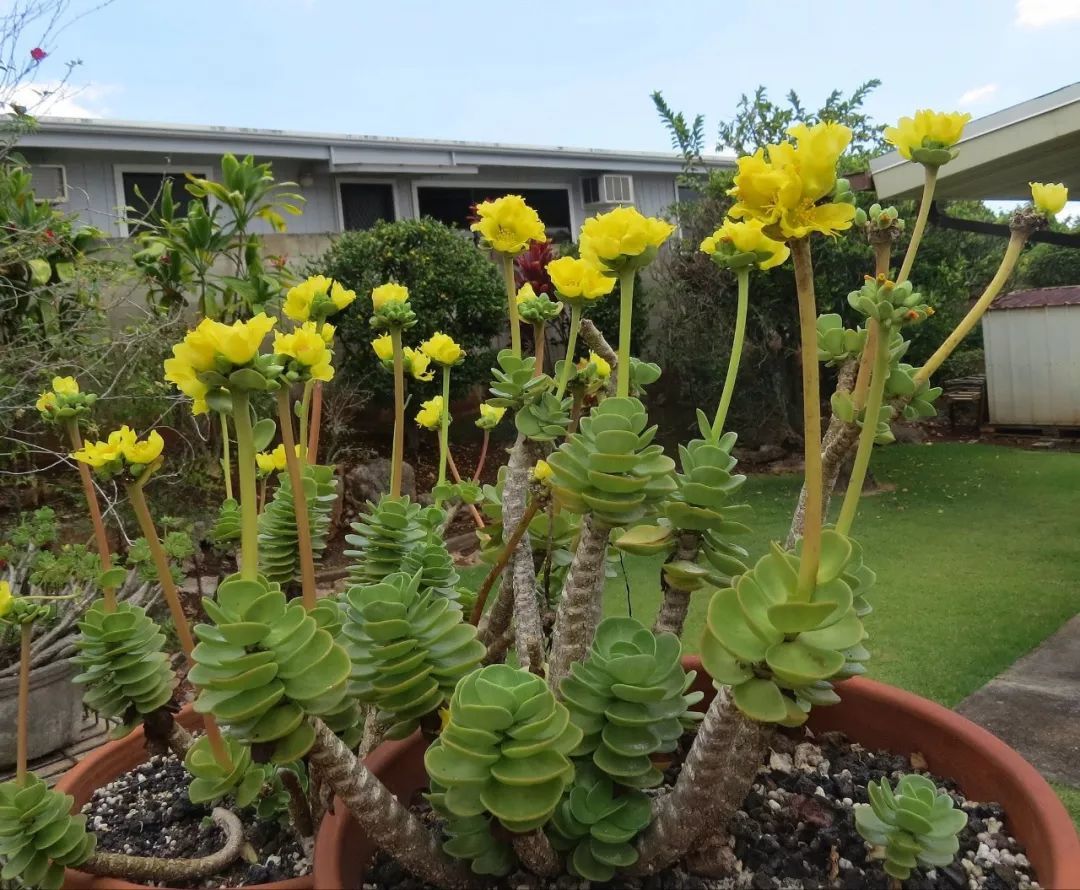 如果你看到过金钱木开花,那你会发现它的花朵就和普通的大花马齿苋或太阳花非常相似,它们的亲属关系是非常相近的,都是马齿苋属的植物。