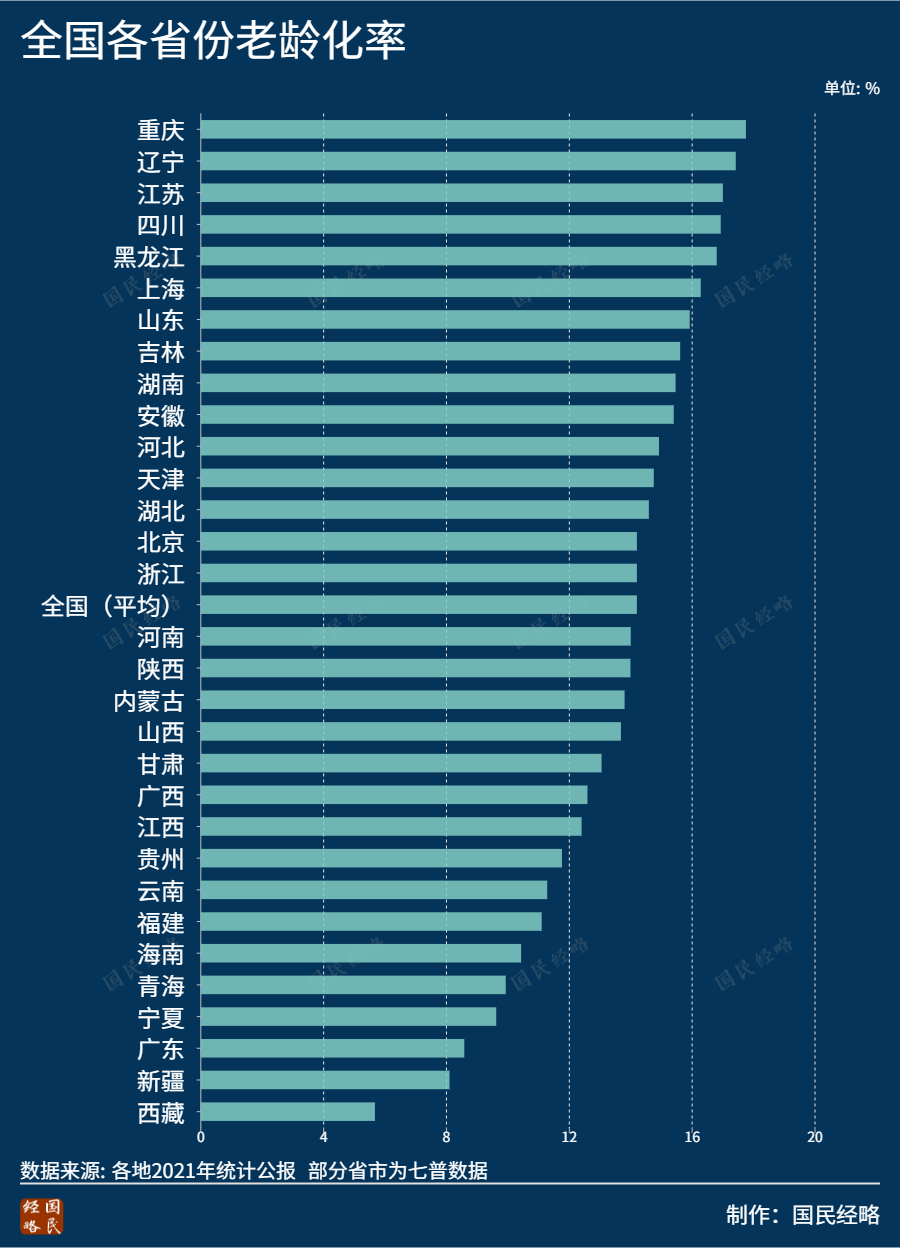 此外,一些以高出生率见长的人口大省,老龄化形势同样严峻,山东、湖南、湖北、河北老龄化率均超过全国平均水平。