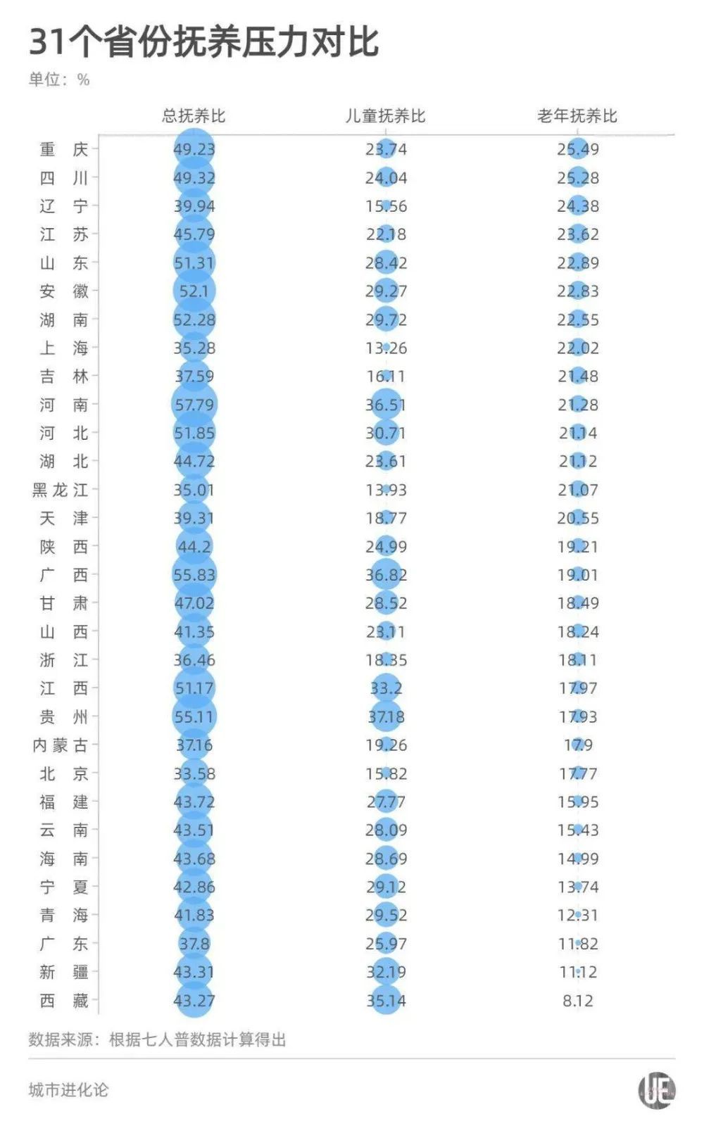 作为另一个极端的广东,老年人口抚养比仅为11.82,相当于每8-9个年轻人对应1个老人。