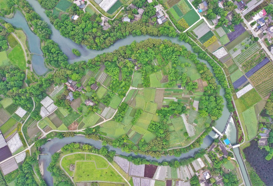 图为4月18日在成都市郫都区安宁村拍摄的徐堰河。(无人机照片)新华社记者 刘坤 摄