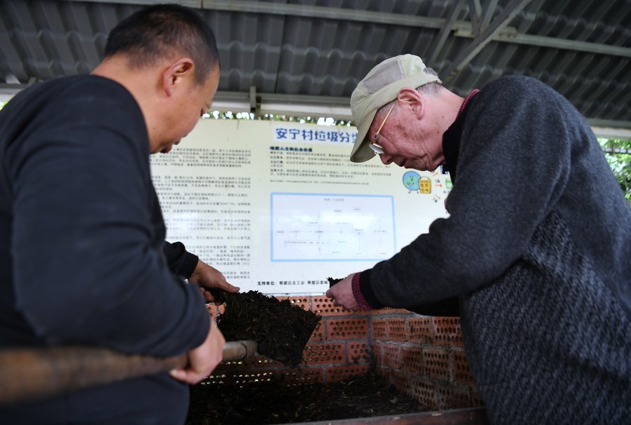 4月18日,陈庆恒(右)在指导安宁村绿色乡村营造师罗光建如何高效堆肥。新华社记者 刘坤 摄