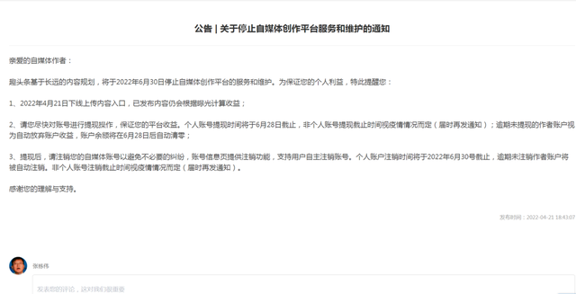 简单地说,就是从2022年4月21日这一天起,趣头条不再是“自媒体”平台,并将在6月30 日后彻底告别这个江湖。