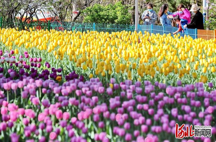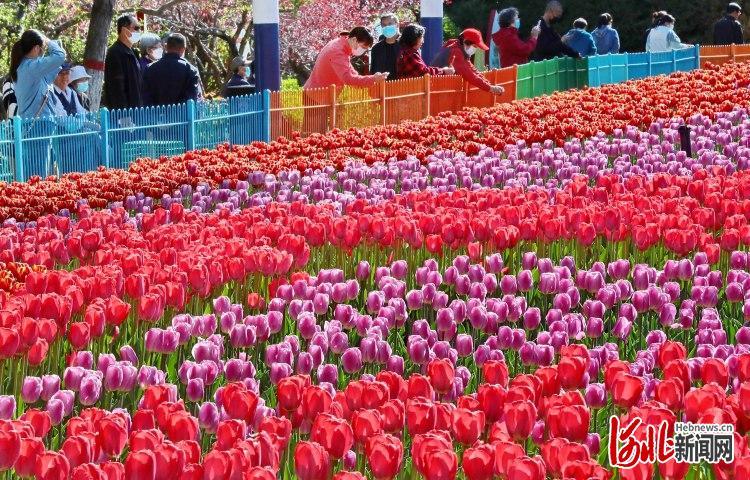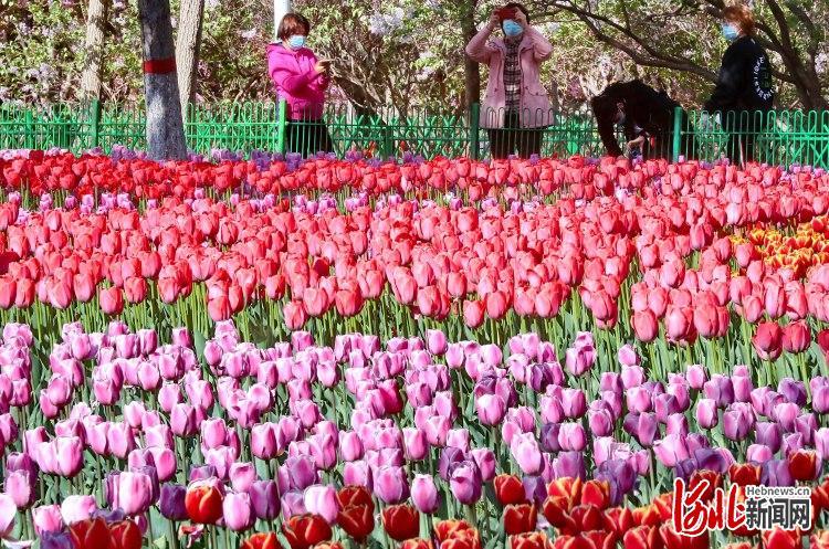 2022年4月22日,河北省秦皇岛市海港区新世纪公园内,市民在观赏郁金香。近日,河北省秦皇岛市海港区新世纪公园的1600平方米的郁金香到了盛花期。据了解,今年海港区园林绿化中心精选7种颜色的郁金香品种进行栽植,花卉设计方案以近景绿化元素、中景建筑元素寓意城区高速发展,远景则为保护生态自然的大格局,让人们感受到城市发展日新月异的同时,享受自然的拥抱。色彩缤纷的郁金香犹如七彩调色盘,吸引众多游人前来观光游览。通讯员曹建雄摄影报道