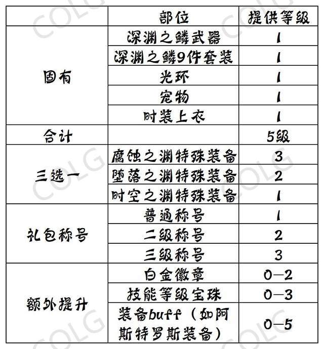 注:当前版本由于有希曼buff及精灵活动buff等影响,各位小伙伴一定要根据下表以实际等级为准,切勿被换装栏等级欺骗。
