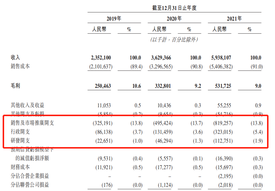 2019年-2021年,圆心科技的销售及市场推广开支分别为3.25亿元、4.95亿元和8.19亿元,占比分别为13.8%、13.7%和13.8%。
