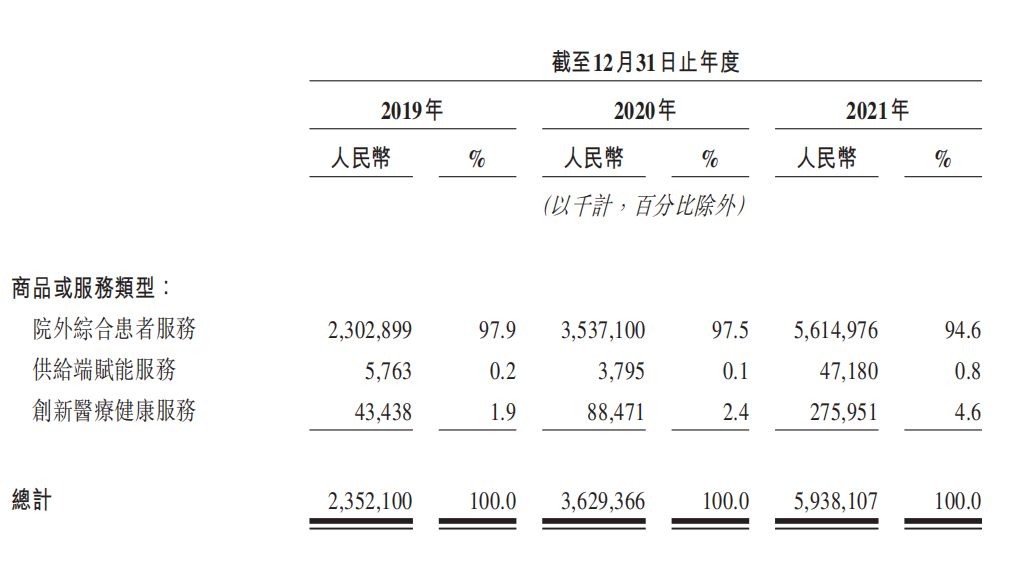 首先圆心科技的业务集中度仍非常高,超九成的收入由院外综合患者服务这一业务板块所供应。2021年,院外综合患者服务收入在公司当期总收入中的占比高达94.6%。供给端赋能服务、创新医疗健康服务为圆心科技分别贡献0.8%、4.6%的收入。