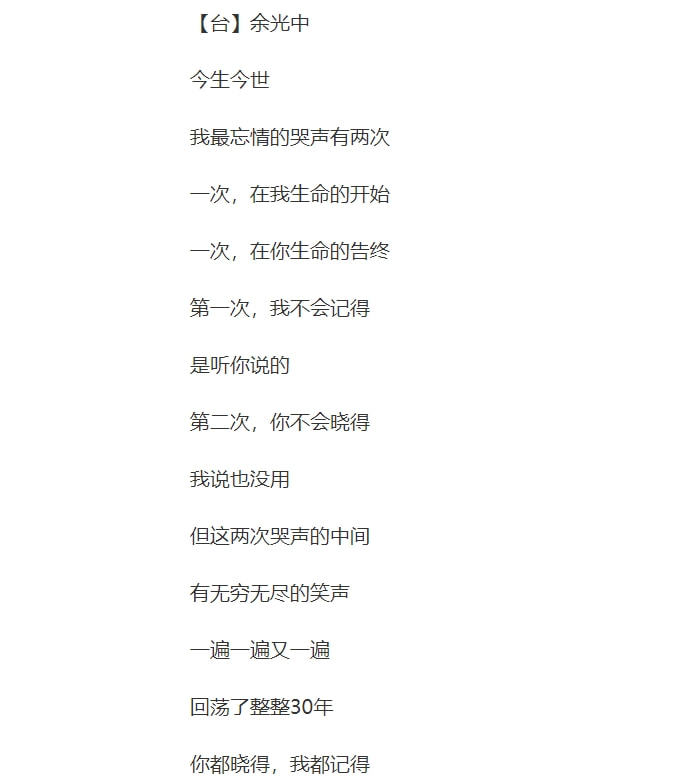 1958年,余光中的母亲因积劳成疾过世,享年53岁。此时余光中的孩子尚未满月,祖孙二人尚未谋面便阴阳两隔,伤感不已的余光中写下名篇《今生今世》追忆母亲。