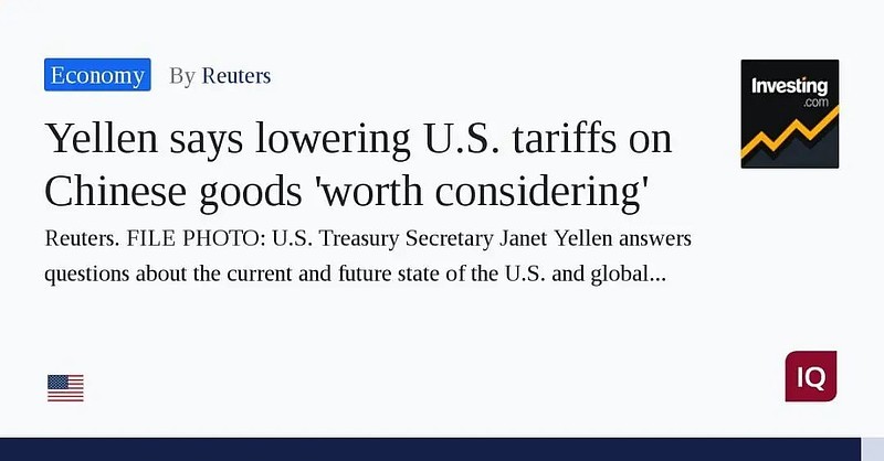 4月22日,美国财政部长珍妮特·耶伦在电视上说,降低对中国商品的关税“值得考虑”。