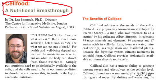 A Nutritional Breakthrough, 翻译成中文应该是“营养学的突破”,作者是Dr. Laz Bannock,似乎和葆婴的宣传单都能对得上。等等,最上面那个Cellfood是什么?链接这篇文章的这个网站的简介里面写着,这是一家为Nu Science Corp担任经销商已经长达15年的公司,那么Nu Science Corp又是什么?和USANA有关系吗?