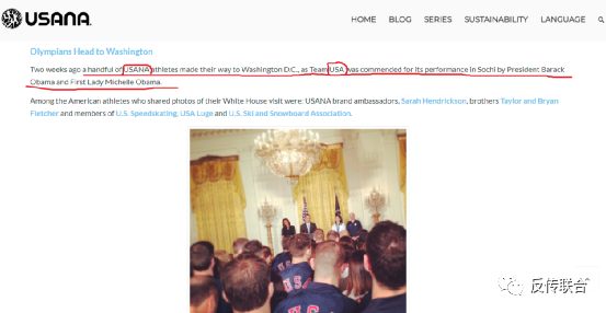 美国人对体育普遍热情高涨,总统接见体育明星实属家常便饭。USANA作为一家保健品企业,赞助体育明星也属常规操作。但是美国东奥代表团有200多人,接受USANA赞助的不过区区数人而已。按照USANA自己的说法,也不过就是a handful of USANA athletes,意思是USANA赞助的运动员一只手就能数得过来。真正列出姓名来的其实只有三个人,另外还有美国速度滑冰协会、美国无舵雪橇协会和美国滑雪和单板滑雪协会三个体育机构,但并不是这些机构所属的运动员接受了USANA的赞助。在这篇USANA的官方新闻里还耍了一个花招,在英语中美国队叫做Team USA,而USANA的前三个字母也是USA,于是USANA故意把USANA Athletes和Team USA混在一起,不知情的人很容易误以为美国队全都是USANA赞助的,甚至把Team USA直接当成Team USANA。