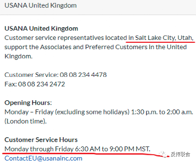 虽然USANA产品在1998年就进入了英国市场,但是USANA公司在英国根本连一个办事处都没有。在USANA的主页上显示,英国的客户和经销商如果遇到任何问题,只能联系位于USANA美国盐湖城总部的客服人员,而且还只能在美国中部山地时间(MST)周一到周五早上6:30到晚上9:00(相当于英国时间下午1:30到凌晨4:00),过时不候。