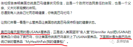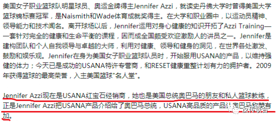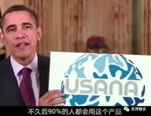 至于那个美国篮球明星Jennifer Azzi,的确是USANA的经销商,并且在USANA的网站上也曾多次出现,但其中没有任何一条与奥巴马有关的报道。倘若此人真的是把奥巴马都给拉进了USANA的朋友圈,USANA还能不疯狂吹捧她的这个丰功伟绩吗?这个Jennifer Azzi也曾到访白宫,受到奥巴马的接见并与其合影,丝毫不足为奇。但奥巴马身为美国总统,衣食住行都受到严密的保护,岂能轻易听从一个外人的建议就随随便便乱吃东西?美国保健品的品牌成千上万,USANA在美国的保健品行业根本就是一个名不见经传的货色,就算奥巴马真需要服用保健品,也轮不到USANA。否则,USANA的网站上早就挤满了奥巴马服用其产品的广告了。在美国,如果USANA胆敢利用奥巴马的名义虚假宣传,马上就会被监管机构盯上,分分钟罚到死。所以,借它十个胆子,也不敢无中生有。但是在国外,摆脱了美国法律的管辖,这种事情就不新鲜了。在中国某些网站上,便流传着这样的影像: