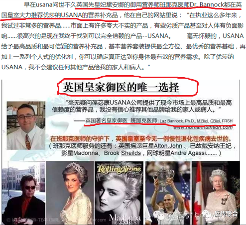 这位“班奈克医师”到底是何方神圣?连英国女王和戴安娜王妃,还有一大票欧美明星大腕儿都能被他带成USANA的客户?尤其是戴安娜王妃,1997年8月不幸因车祸去世,而USANA产品是1998年才获批进入英国市场的,若是戴安娜王妃生前也使用USANA产品,莫非还是有人给她代购的?