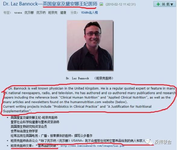 与奥巴马的故事类似,在USANA公司的官网上,根本查不到任何关于“英国皇室”或“女王”的信息。翻遍整个互联网,所有声称“USANA是英国皇室指定保健品”的信息均源自葆婴,其中大部分都提到一个人,班诺克医生(Dr. Laz Bannock),所谓“英国皇室御医”:
