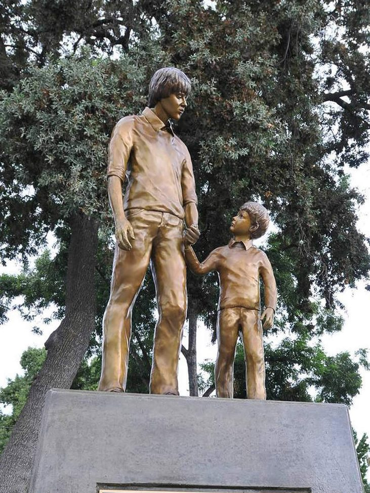 雕像上,14岁的史蒂文牵着5岁的提米的手,大步迈向前。这座雕像献给勇敢的史蒂文,也献给所有的孩子。希望走失的小孩,都能拉住史蒂文的手,找到回家的方向...