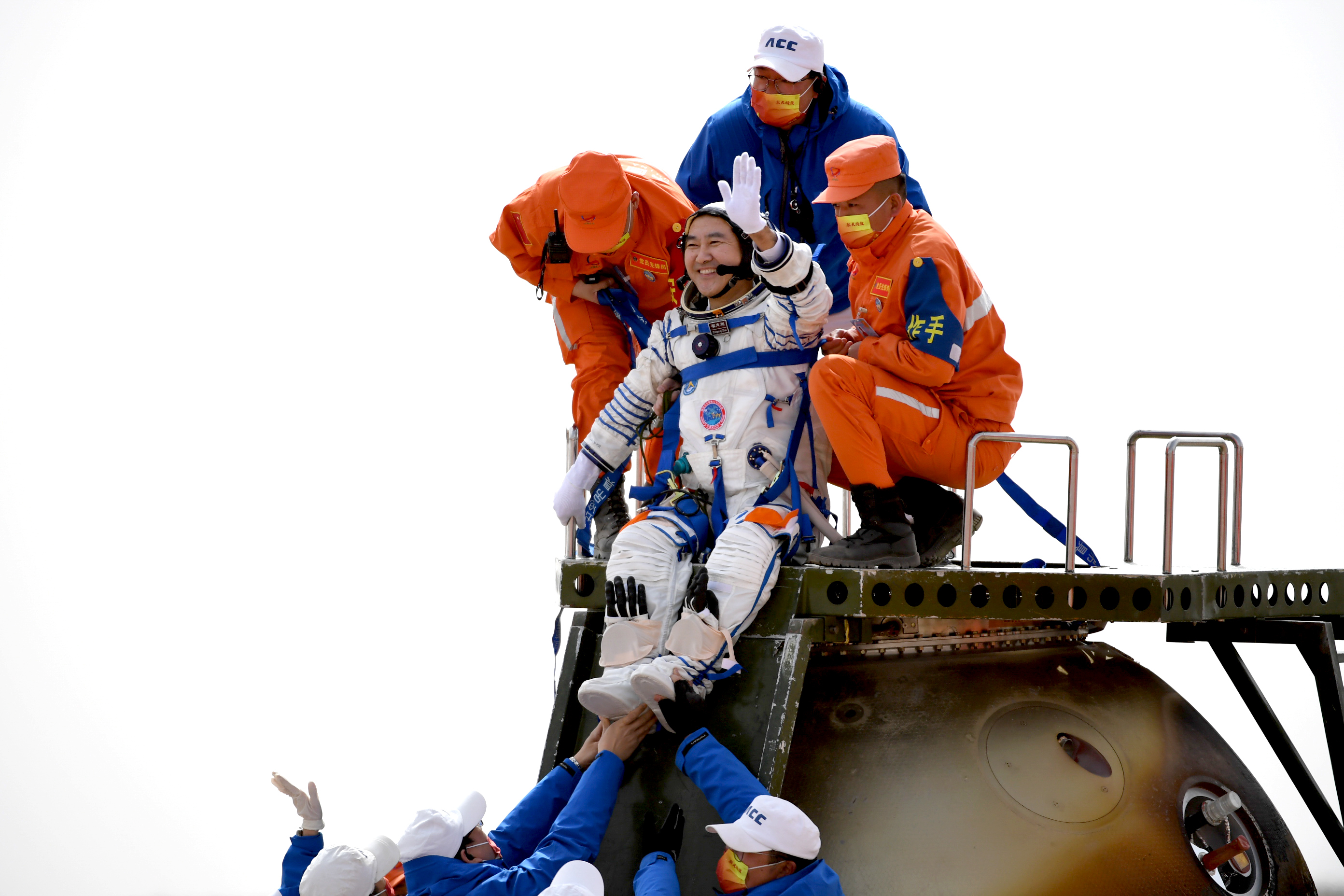 新华社照片,北京,2022年4月23日 神舟十三号载人飞船返回舱成功着陆 4月16日,神舟十三号载人飞船返回舱在东风着陆场成功着陆。这是航天员翟志刚安全顺利出舱。 新华社记者 彭源 摄