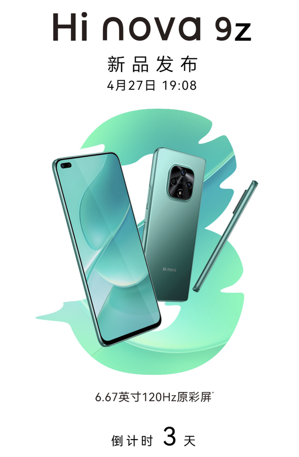 【手机中国新闻】4月24日上午,手机中国从手机品牌Hi nova官方了解到,旗下新品Hi nova 9z将于4月27日19:08正式发布。官方介绍到,新机搭载120Hz原彩屏,屏幕显示清晰流畅,拥有沉浸视野。