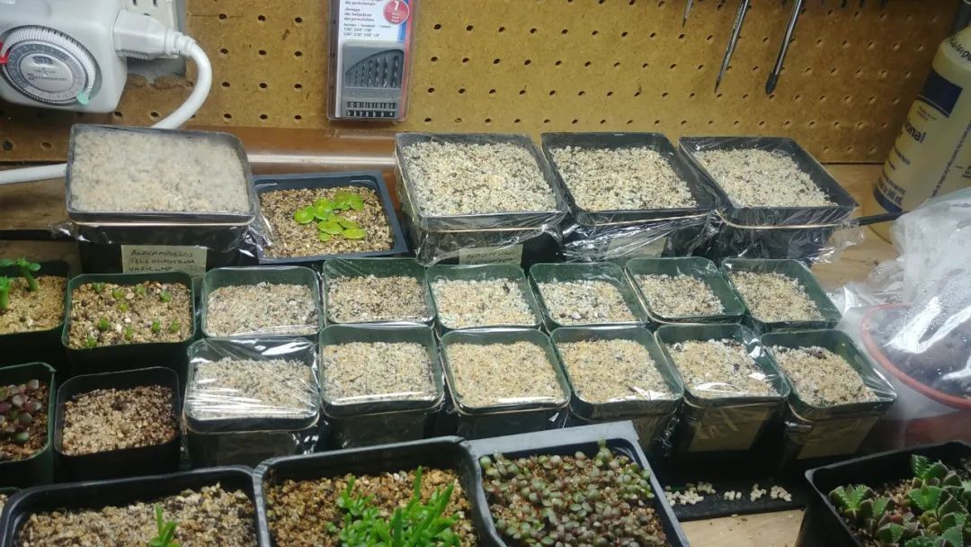 也可以用到我们平常吃饭所用到的塑料盒子播种,特别是市面上的一次性打包盒,顶部会有盖子,而底部没有排水孔也没关系,盖上盖子后可以让土壤中实现很好的水汽循环,就营造一种温室的效果,也是有利多肉植物种子快速发芽的。