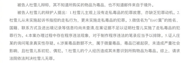 据悉,杜雪儿的辩护律师在法庭上称她没有意识到自己购买的东西是du 品,没有实施走私du 品犯罪,且涉案du 品数额不大,未造成社会影响,主张杜雪儿无罪。