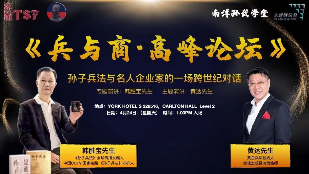 2022年4月24日新加坡举办首届《兵与商•高峰论坛》,本次活动特邀CCTV国家宝藏节目《孙子兵法》守护人韩胜宝先生与会发言,并与全球著名宏观经济分析师、持牌企业金融顾问黄达先生,以及新加坡各行业企业家、社会知名人士围绕《孙子兵法》在商业上的具体应用展开对谈与探讨。