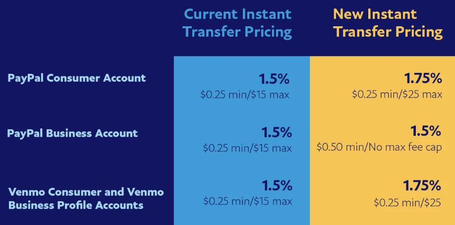 借助此功能,客户可以轻松地将资金转入银行账户或借记卡,并收取一定费用。目前,PayPal 消费者账户用户支付转账金额的 1.5%,最低费用为 0.25 美元,最高为 15 美元。相同的费率适用于 Venmo 消费者和 Venmo 业务资料账户。